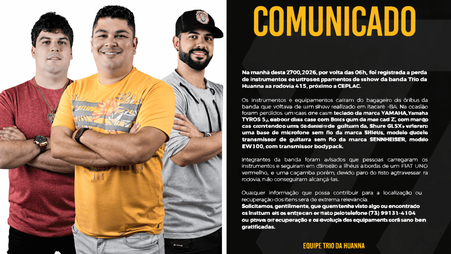 A banda Trio da Huanna informou que perdeu instrumentos e equipamentos de show na manhã desta terça-feira (27), por volta das 6h, após o bagageiro do ônibus se abrir na BR-415, nas proximidades da Ceplac, no sul da Bahia.