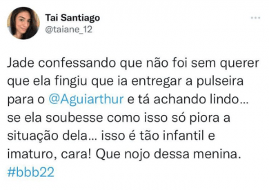 A esposa de Arthur, Maíra Cardi, postou cenas da digital influencer em mentos que dizia ser parceira do moço, prometia ganhar o anjo para salvá-lo e , depois de ser coroada, inverteu todo o jogo, contradizendo suas próprias falas, para criar um enredo que justificasse a indicação do ator ao paredão , por ela mesma, como líder.