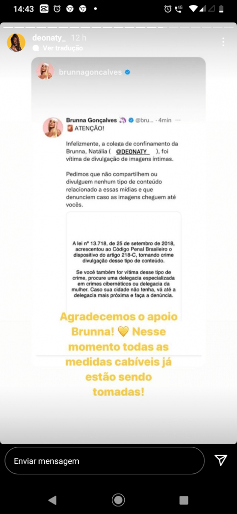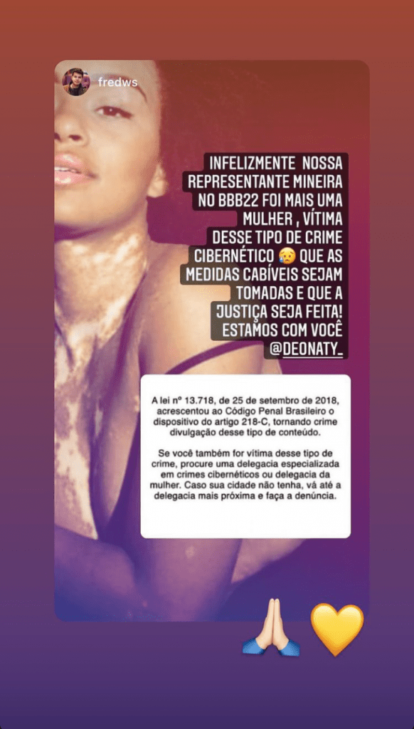 Imediatamente, vários perfis de amigos começaram a respostar o ocorrido, alertando da gravidade do ato de quem posta e compartilha fotos esse tipo de conteúdos , um crime previsto no artigo 218-C, de 2018.