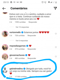 Nos comentários da publicação, Gabriel Medina escreveu, agradecendo a ela pela parceria durante esse tempo, levando a rumores de que o romance conturbado entre os dois havia chegado ao fim.