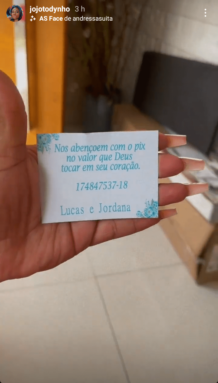 Jôjo publicou em vídeo nós stories um pedido aos que a criticam ; presentes para os noivos, em forma de pix. Bem humorada , mostrou cartão com os dados do pix e não fez exigência de valor, pois disse está aceitando R$1,00 , R$ 5,00 , R$10,00, “no valor que Deus tocar em seu coração”, completou ela , lendo exatamente a mensagem , que estava no cartão.