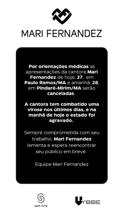 A cantora Mari Fernandez cancelou dois shows programados para este domingo (27) e segunda-feira (28), nas cidades de Paulo Ramos e Pindaré-Mirim, no Maranhão, devido ao agravamento de um quadro de virose.