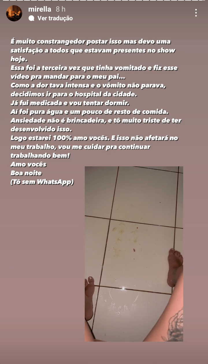 A famosa gravou um desses momentos, para enviar ao pai e pedir orientação do que fazer, diante dos sintomas apresentados. A orientação foi de buscar atendimento médico.