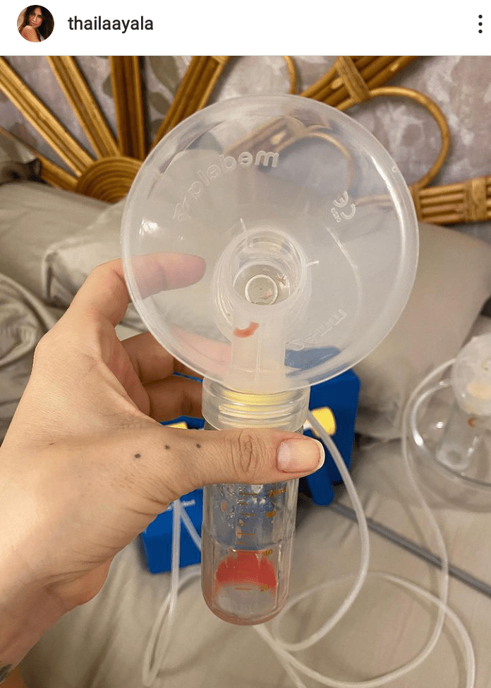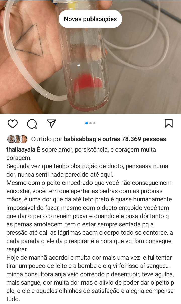 Expôs em seus fide, nessa segunda-feira (07) que tem ficado com leite empedrado nas mamas, mesmo fazendo uso das Bombinhas de lactação. Condição que gera dor, machucado e até sangramento, como o ocorrido , ao fazer a extração do leite com a bombinha .