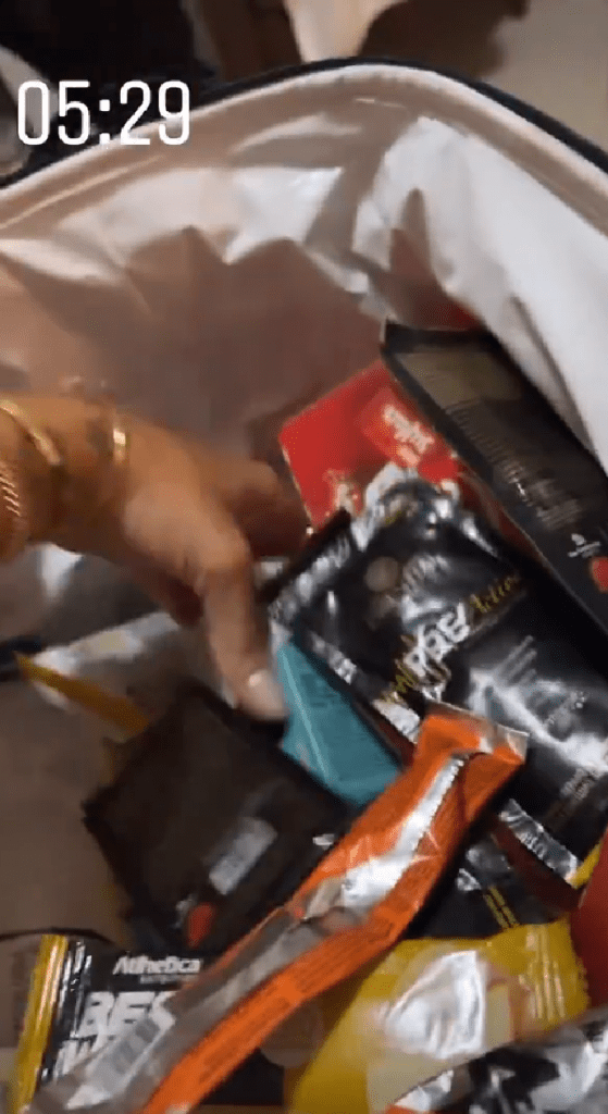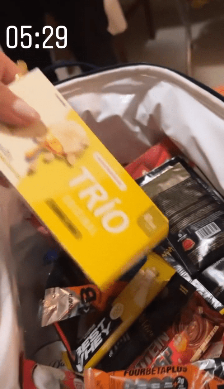 A moça mostrou tudo que recolheu do camarim do evento, como barrinhas de cereais, chocolates, água, entre outras coisas.