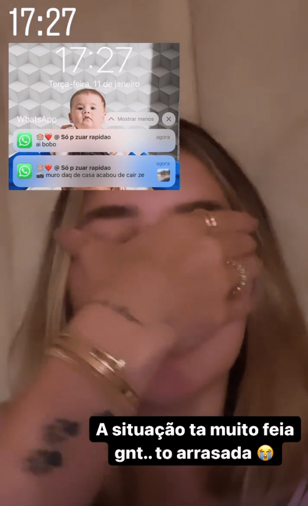 Mostrando imagens de casas alagadas pela chuva , Virginia revelou se tratar da casa de um amigo, que mora em Governado Valadares . No mesmo momento em que falava nos stories , recebeu a notícia que o muro da casa dele havia caido.